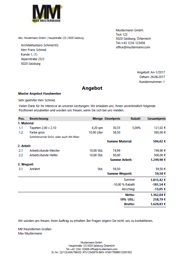 - Rechtliche Absicherung: Ein schriftliches Angebot kann im Streitfall als rechtliche Grundlage dienen und Missverständnisse vermeiden.