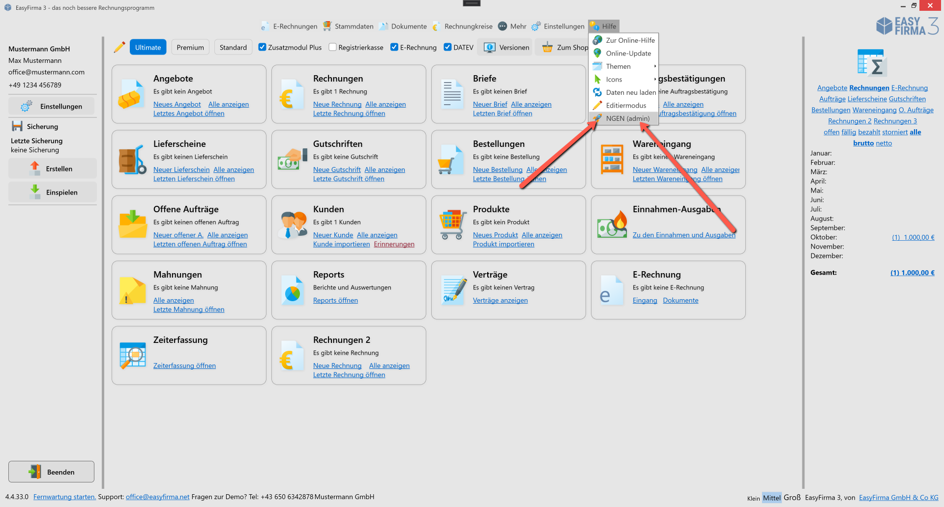 1. Öffnen Sie EasyFirma, klicken Sie oben im Menü auf „Hilfe“ und dann auf „NGEN (admin)“.