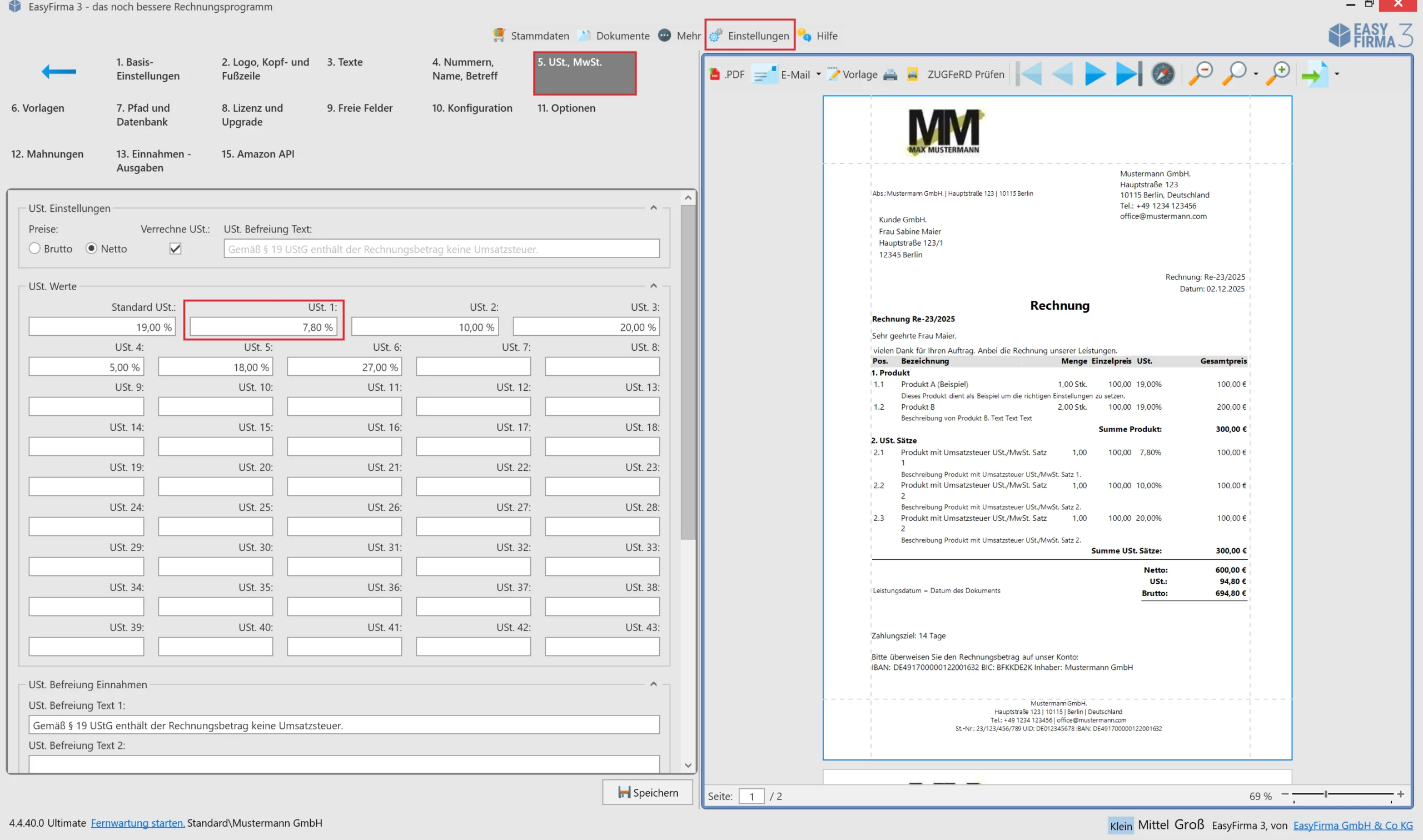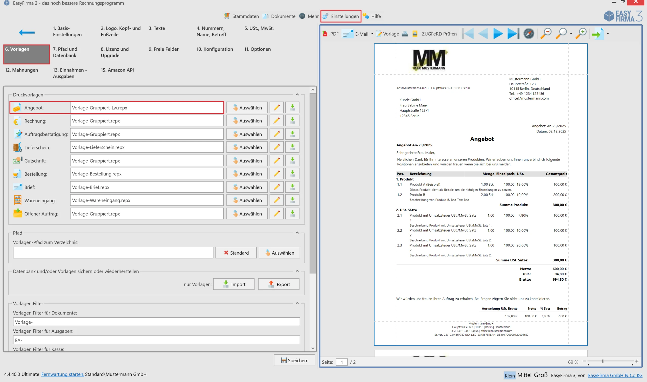 Danach wählen Sie die Vorlage-Gruppiert-lw für die Landwirtschaft aus. Dort ist das Format der USt. bzw. MwSt. in der Vorlage richtig eingestellt.