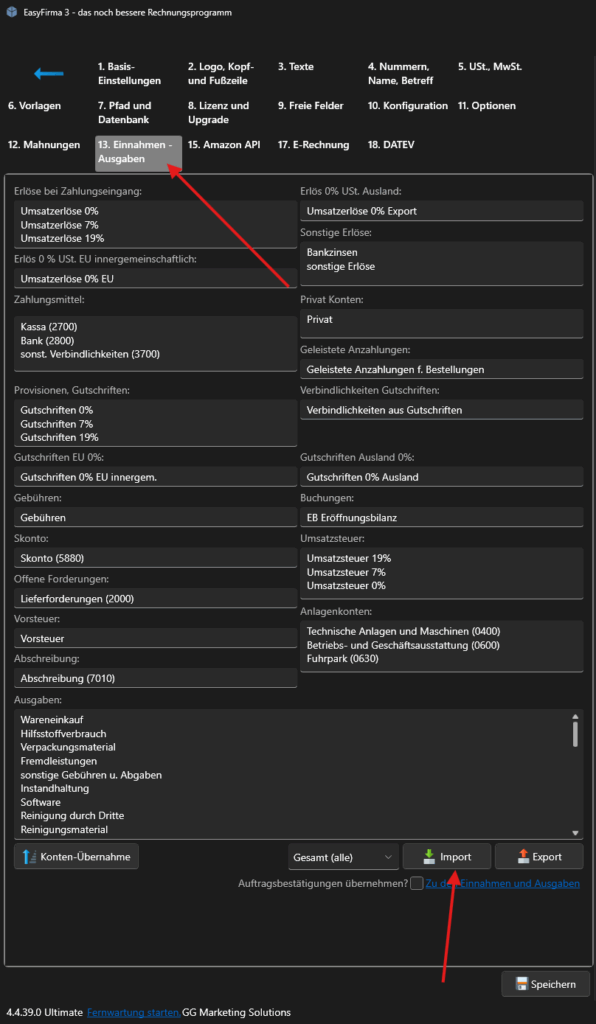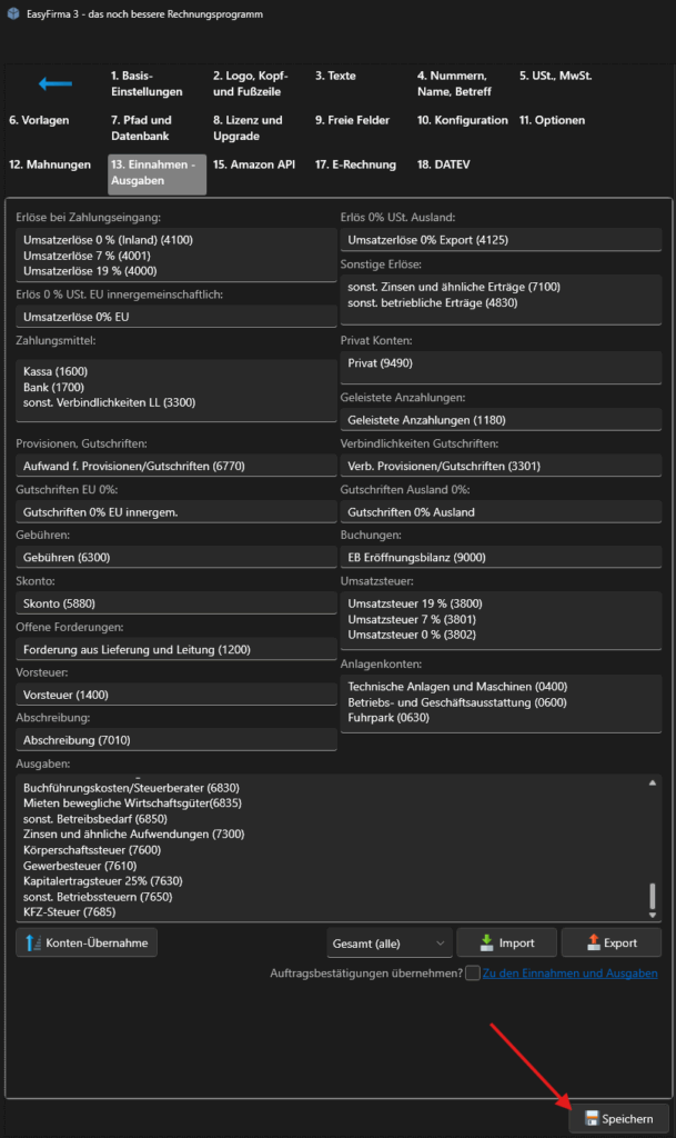 EasyFirma lädt den Kontenplan und trägt alle relevanten Konten automatisch in die Felder ein.