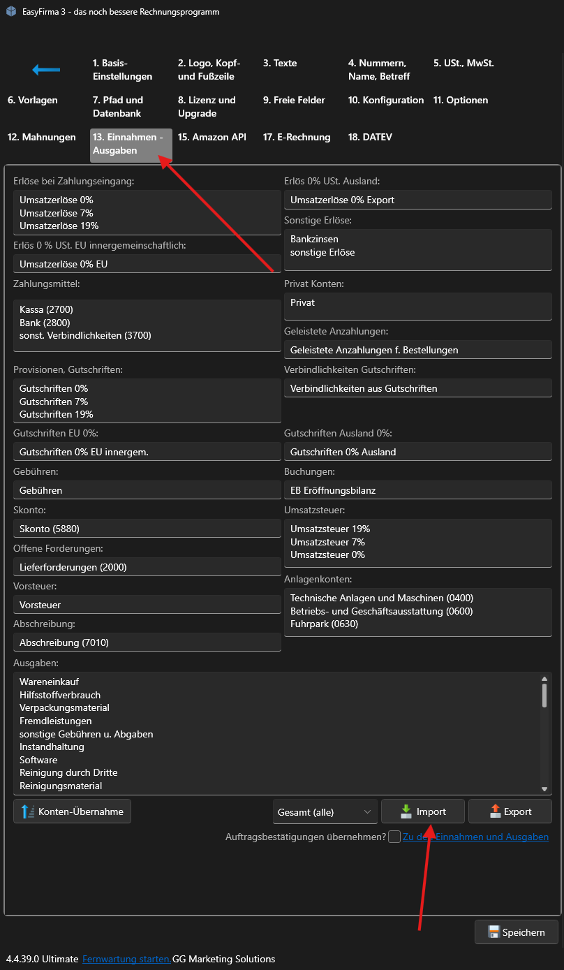 Hier sehen Sie alle Konten, die für Einnahmen-, Ausgaben-, Steuer- und Privatkonten verwendet werden. Sie können diese Werte frei anpassen.