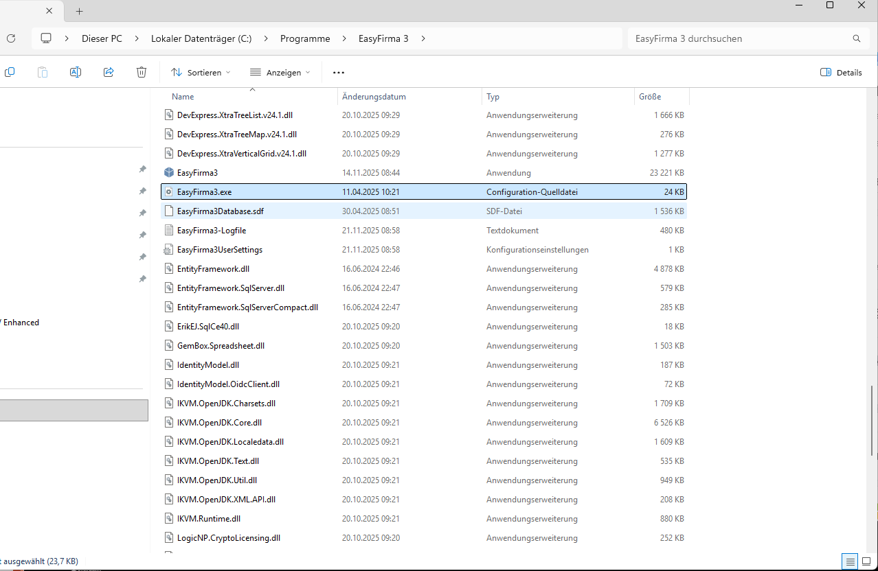 Zuerst zum Installationspfad von EasyFirma wechseln. Dort die Datei C:\Program Files\EasyFirma 3\EasyFirma3.exe.config löschen. In manchen Fällen wird sie im Explorer nur als EasyFirma3.exe angezeigt – das ist normal.