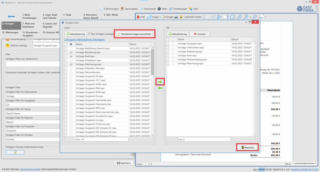 2. Nun öffnet sich das Transferfenster. Klicken Sie nun auf den Button „Standardvorlagen auswählen“ und anschließend auf den grünen Pfeil nach rechts. Die Vorlagen erscheinen nun rechts im Fenster und befinden sich in der Datenbank von EasyFirma. Klicken Sie abschließend auf „Beenden“.