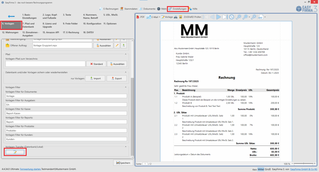 1. Öffnen Sie EasyFirma, wählen Sie „Einstellungen“ und dann „6. Vorlagen“. Klicken Sie anschließend unten links auf den Button unter „Vorlagen-Transfer“.