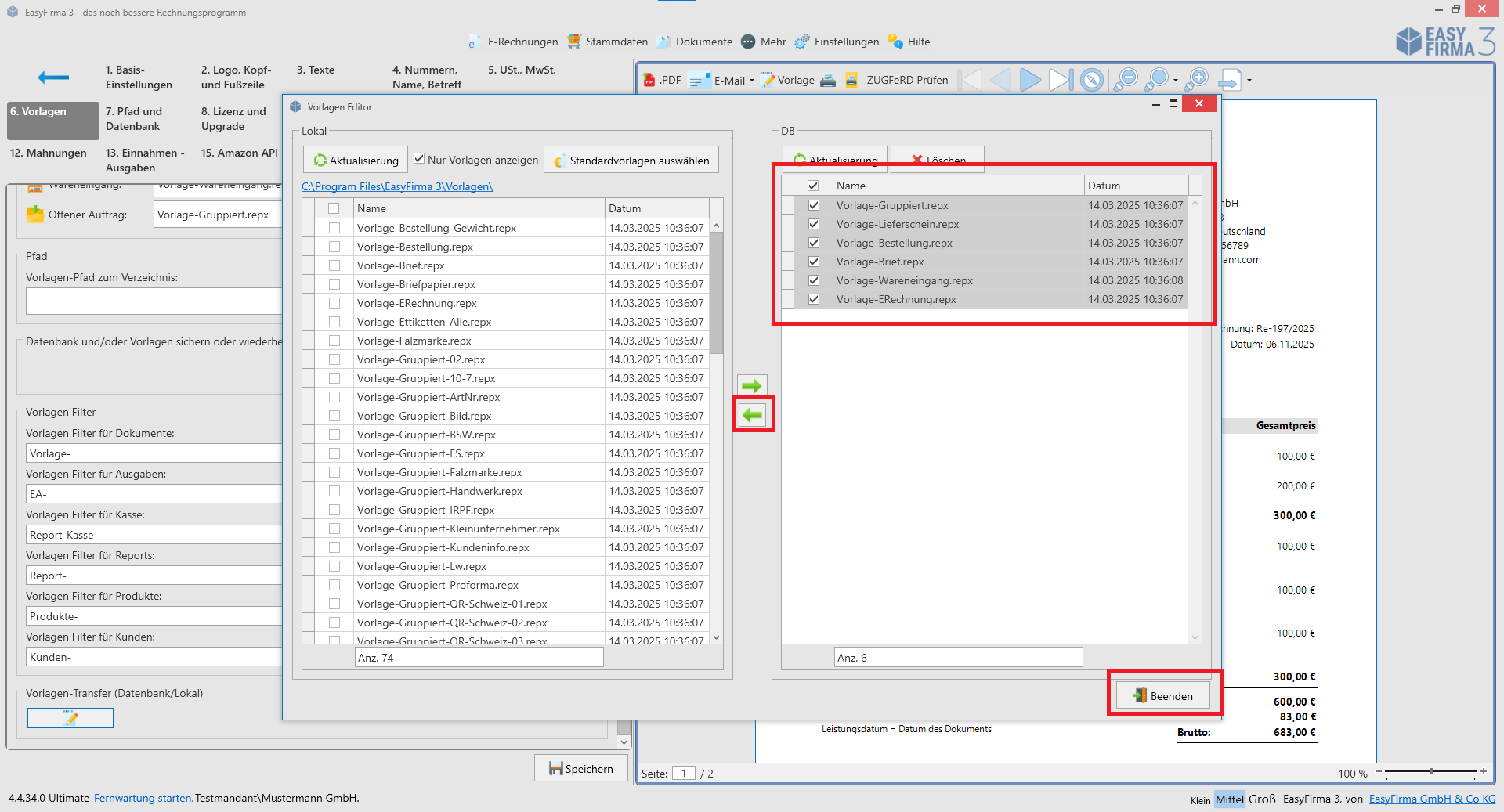3. Öffnen Sie EasyFirma auf Ihrem anderen PC, klicken Sie auf „Einstellungen“, dann auf „6. Vorlagen“, und anschließend unten auf den Button bei „Vorlagen-Transfer“. Das Transferfenster öffnet sich, wählen Sie nun die Vorlagen rechts aus und klicken Sie auf den grünen Pfeil nach links, anschließend auf „Beenden“. Der Transfer ist abgeschlossen und die Vorlagen befinden sich nun auf Ihrem anderen PC.