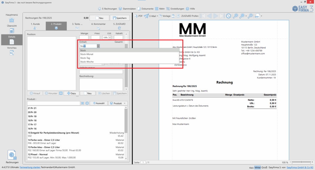 Sobald Sie nun eine Rechnung schreiben, stehen Ihnen unter „Einheit“ zahlreiche Auswahlmöglichkeiten zur Verfügung. Bitte beachten Sie, dass eine Auswahl aus der Liste getroffen oder der Begriff exakt eingegeben werden muss, dass die Einheit korrekt in den XML-Code der ZUGFeRD-Rechnung übernommen wird. Abkürzungen, wie zum Beispiel „Stk.“ sind nicht mehr möglich. Ursprünglich sind die Schemas in Englisch gehalten. Wir haben diese für Sie ins Deutsche übersetzt.