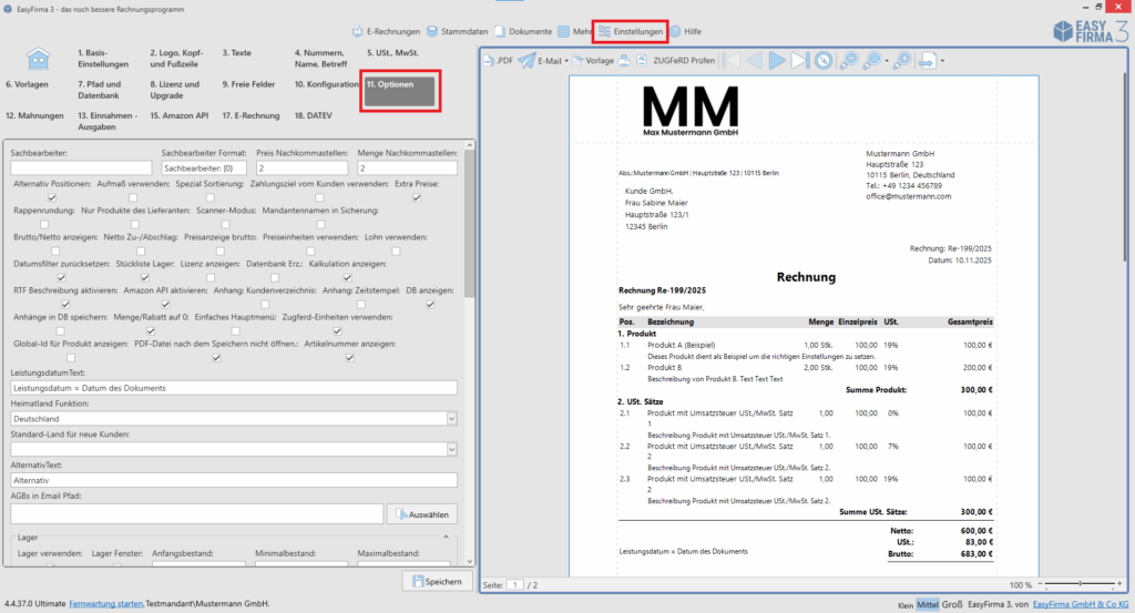 Öffnen Sie EasyFirma und wählen Sie „Einstellungen“ → „11. Optionen“.