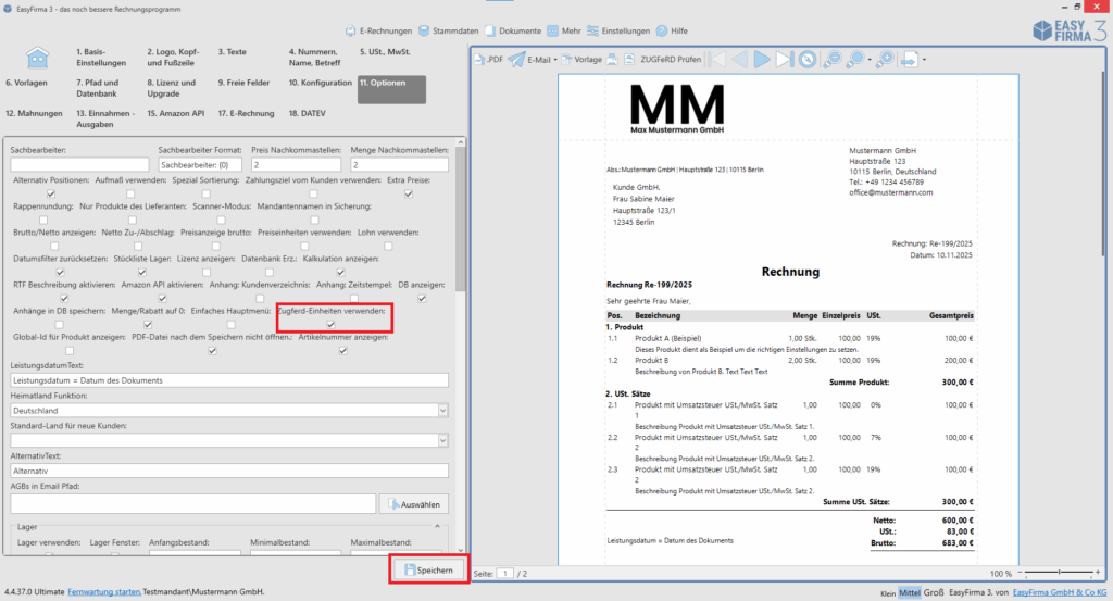 Aktivieren Sie die Checkbox „ZUGFeRD-Einheiten verwenden“.